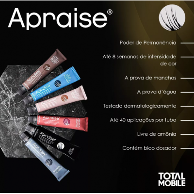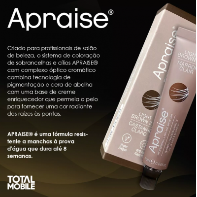 Apraise é uma tintura específica para sobrancelhas, cílios, barba e bigode. As tinturas Apraise permitem criar um volume das raízes às pontas e suas sobrancelhas e cílios ficam mais destacadas e o melhor, de forma natural. É ideal para mulheres e homens que já estão com seus pelinhos brancos, ou para quem está com os pelinhos claros demais. A tinta é livre de amônia e completamente profissional e impermeável (à prova d'água). Nutre e trata enquanto colore, realça fios claros e brancos. Sua consistência homogênea ajuda a manter a tonalidade do pêlo e não tinge a pele. Diferente da Henna, Apraise é utilizada para colorir o fio.